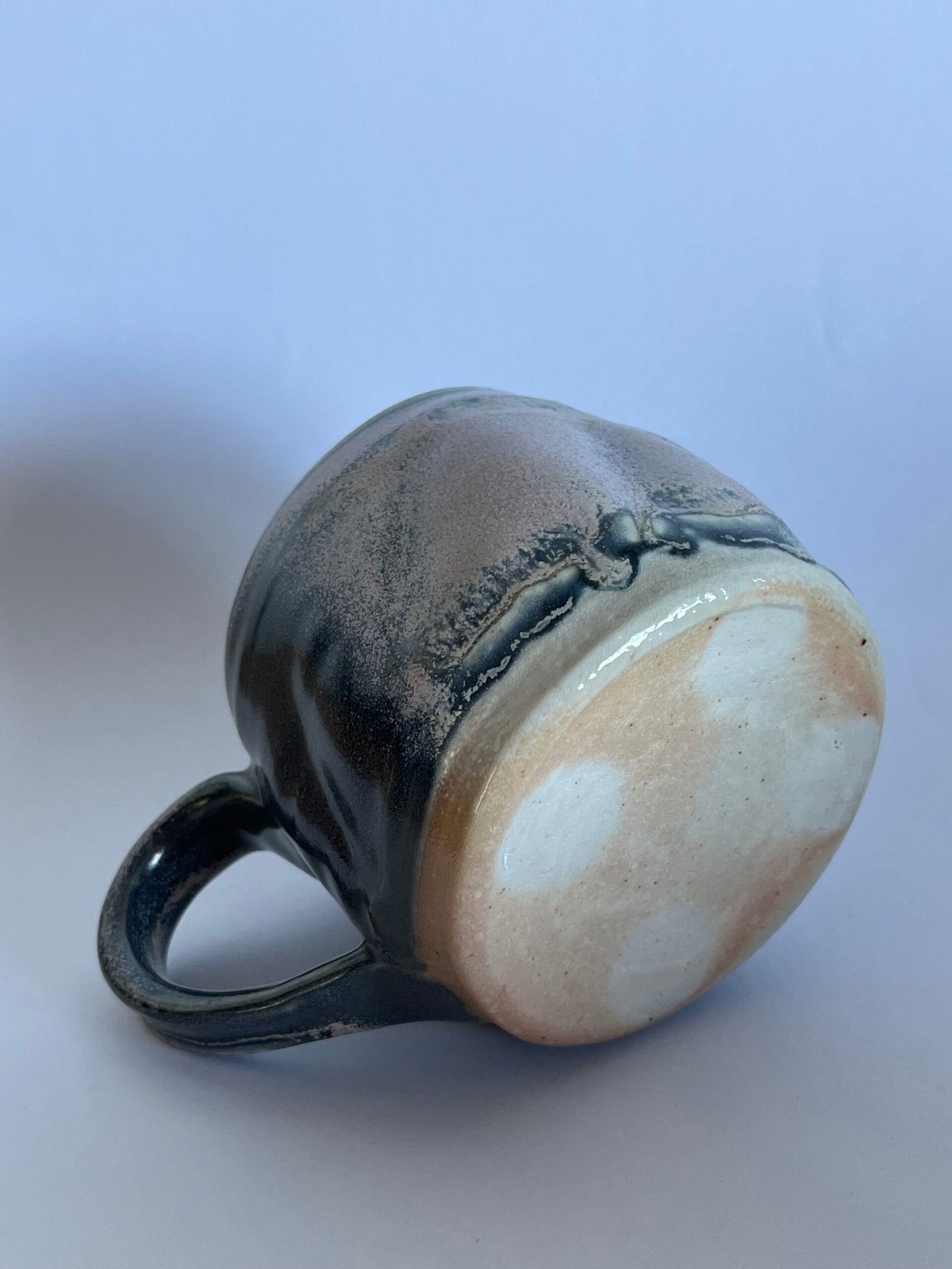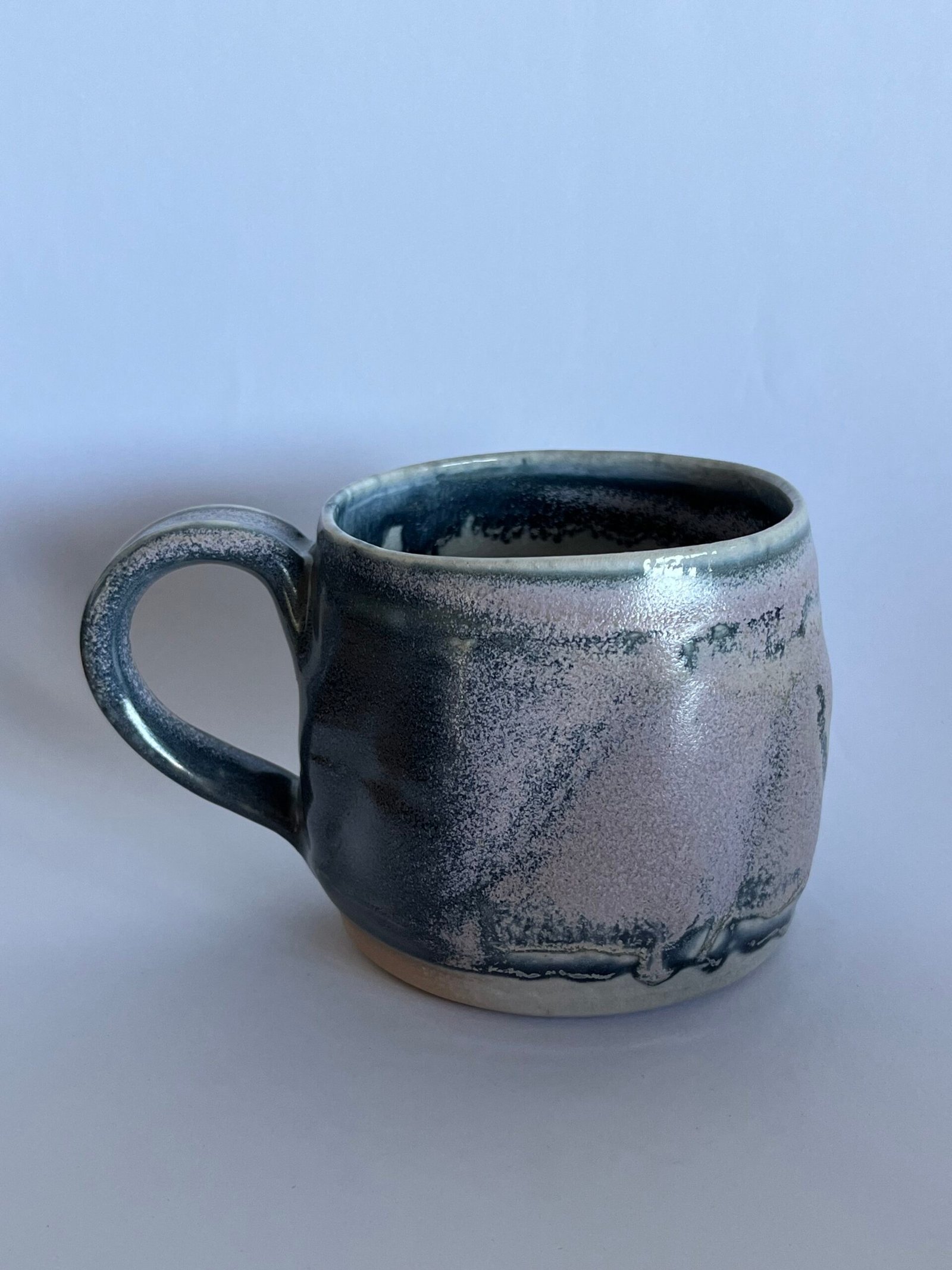 The inner glaze is Neils Smooth, and the outer glaze is a dark blue nickel glaze which flashes where it has been hit with soda. There is some lovely pink crystal growth which occurred due to a hold at the top temperature and a slow cool. It is 7.5cm tall, and holds 230mL. This unique mug is the perfect size for a strong morning coffee.