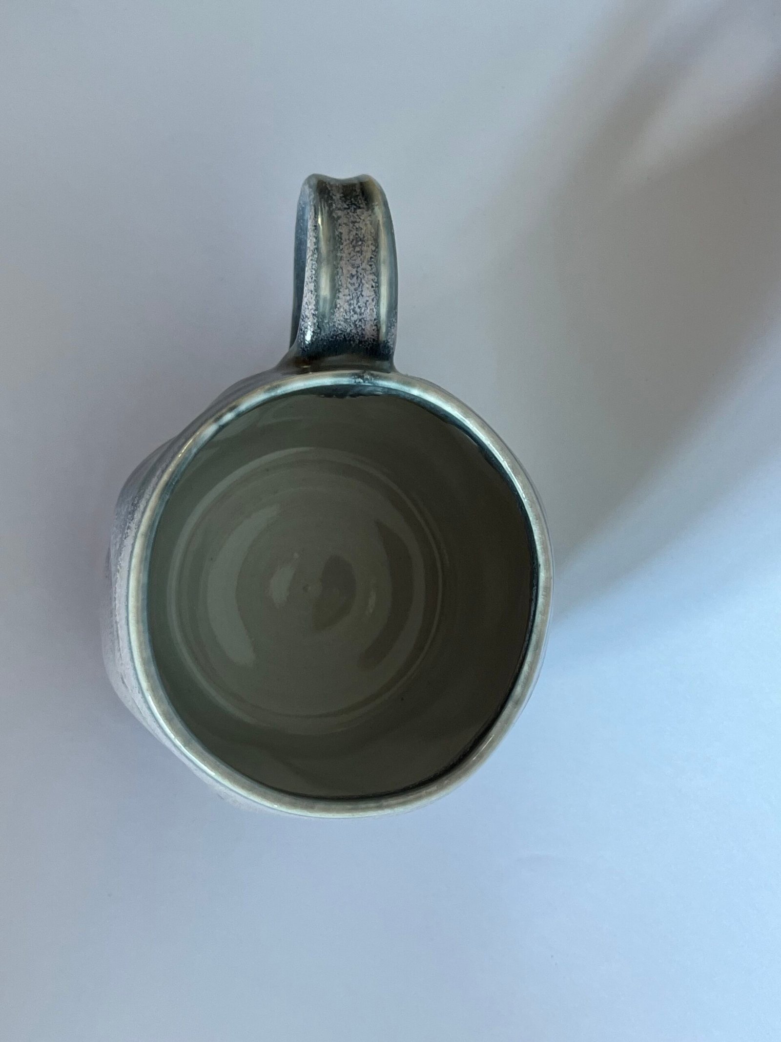 This delicate mug is made of New Zealand clay (Macs Mud Classic White). It was thrown and altered with faceting and indenting on the wheel. It has been soda fired to cone 10 in the Otago Potter Groups Kiln ‘Josephine’.