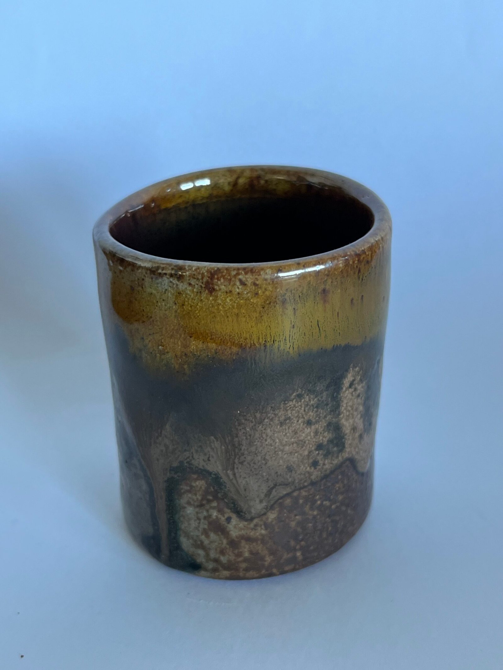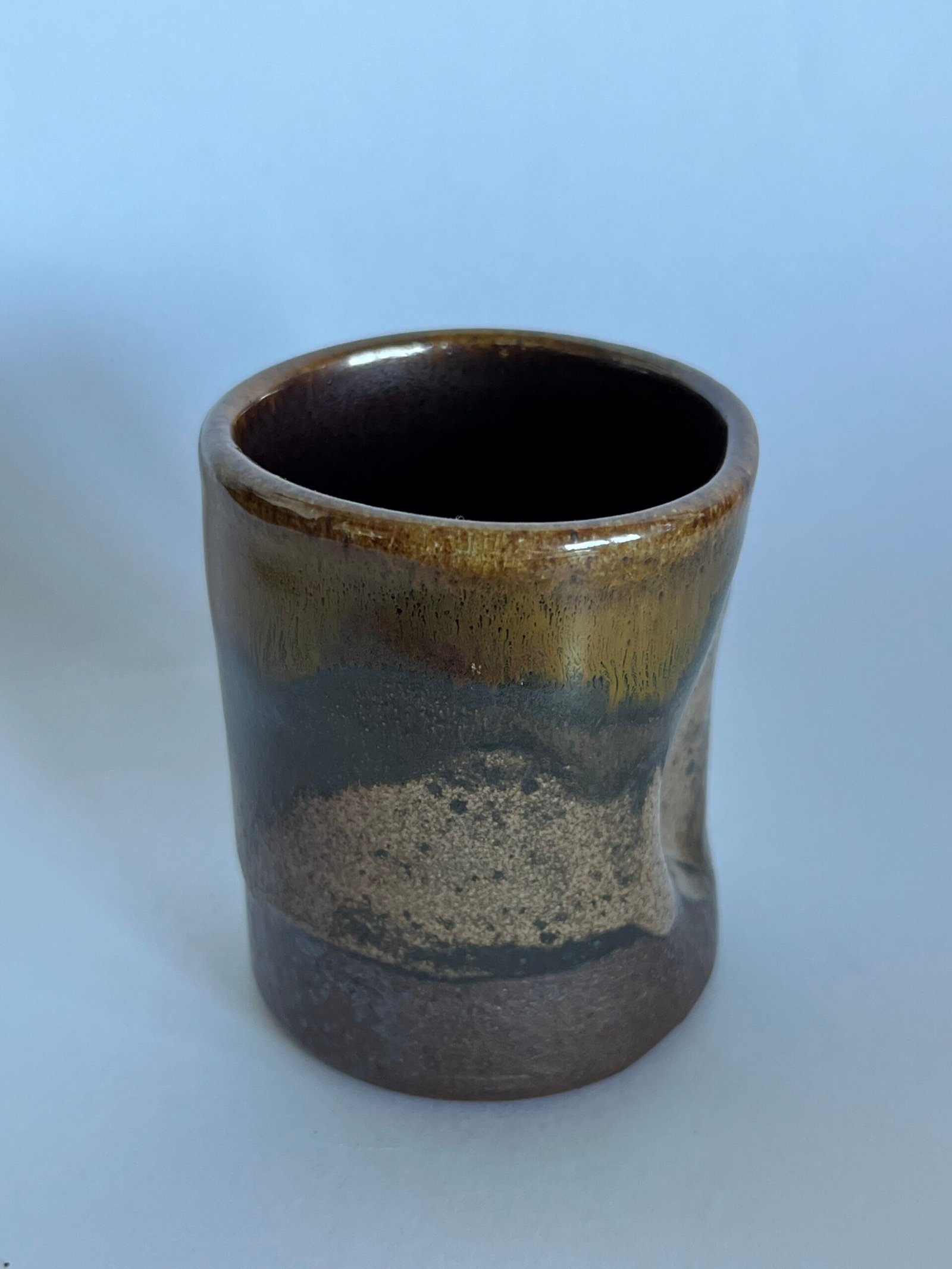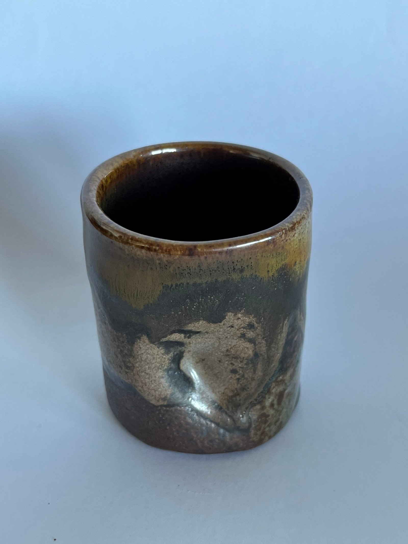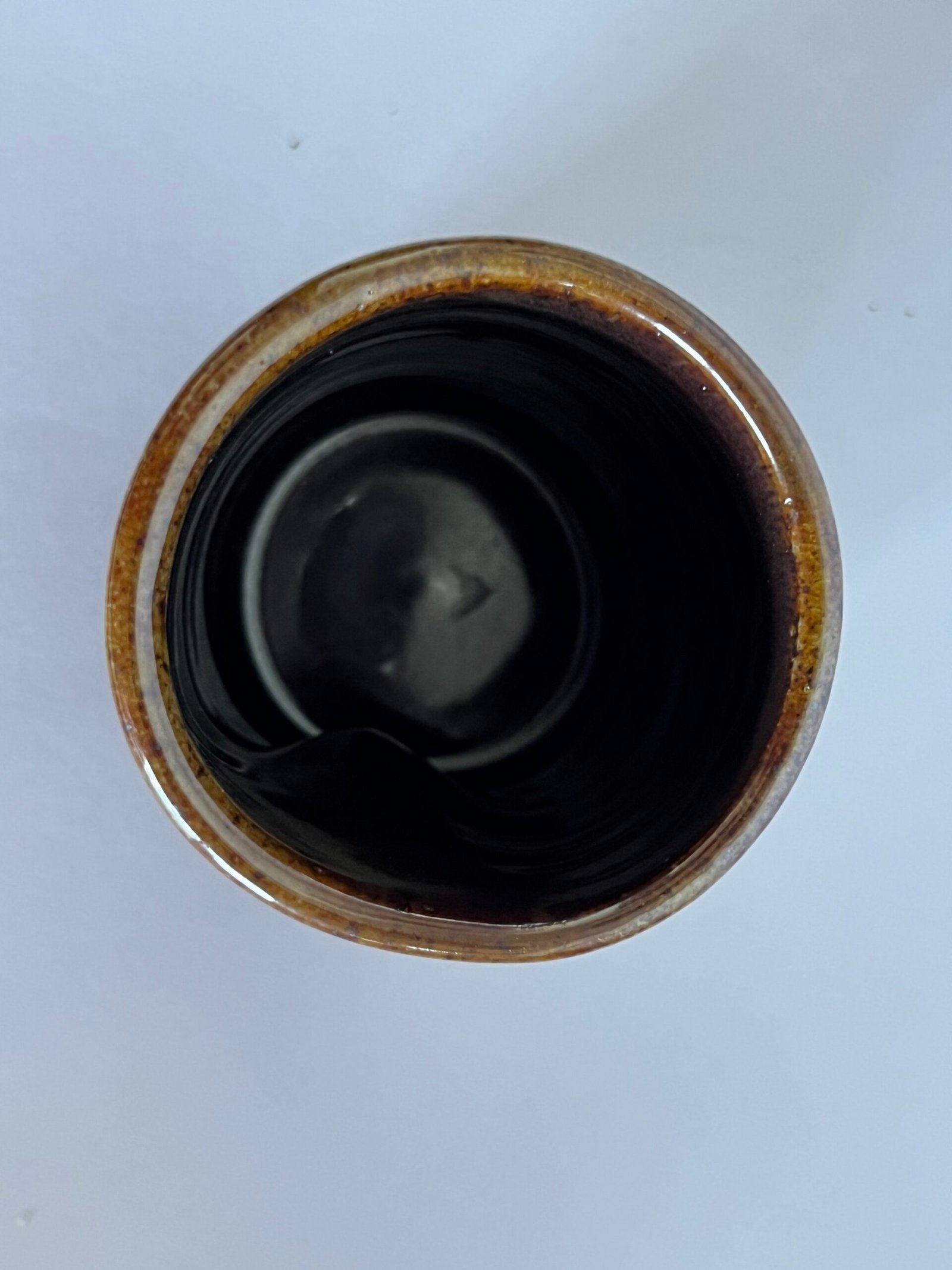 I enjoy sipping port out of similar beakers I made this year, but my two year old informs me that they are definitely fluffy mugs! So either way, treat yourself to a little tipple, or treat your tot to a fluffy. This beaker has a thumb grip feature which was made with the corner of a batter pat. It has been glazed with tenmoku to the inner surface and the rim. Lower down there is a band of speckled glaze which has melted into the tenmoku at the top, and dripped downwards where it was hit by soda. This mug is made of NZ clay, Macs Mud buff stoneware. It was soda fired in reduction to cone 10 in ‘Josephine’ – the kiln at the Otago Potters Group.