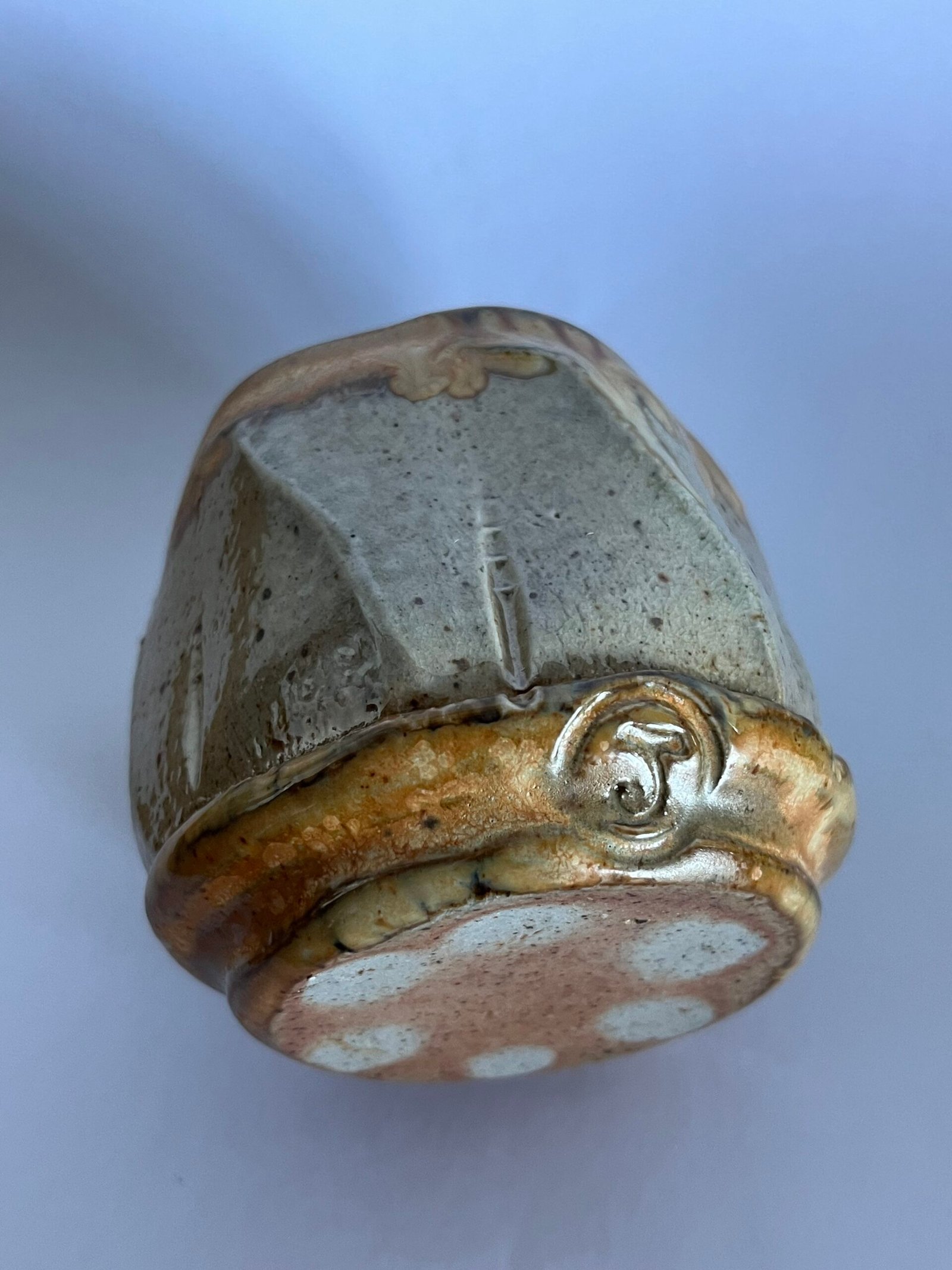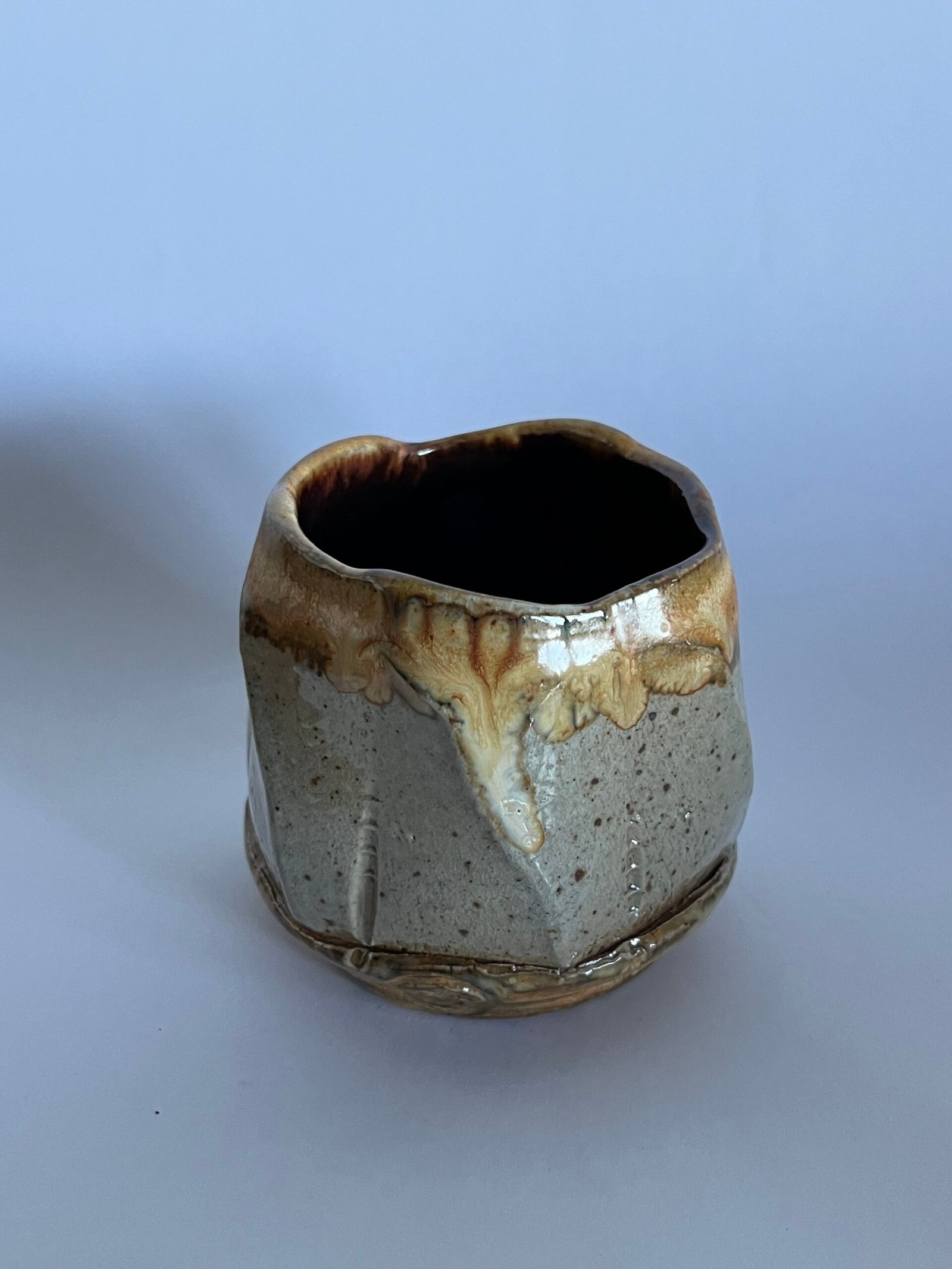 This little flower bud shaped mug is one of my favourite forms for a strong morning coffee. This mug is made of a blend of NZ clays from Macs Mud. It was thrown, then faceted on the wheel, and thrown more to form the twist. The glazes are tenmoku liner, and the outer rim and foot are soda iridescent slip. The beautiful speckle grey of the body is the interaction of the clay with the soda applied during firing. I just love the movement of the slip on the rim, and the undulating rim.