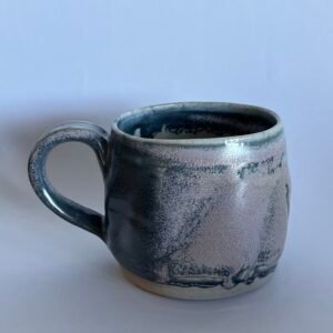 This delicate mug is made of New Zealand clay (Macs Mud Classic White). It was thrown and altered with faceting and indenting on the wheel. It has been soda fired to cone 10 in the Otago Potter Groups Kiln ‘Josephine’. The inner glaze is Neils Smooth, and the outer glaze is a dark blue nickel…