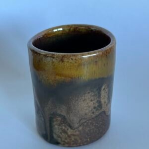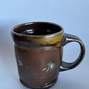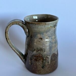 This tall mug was thrown on the wheel from NZ clay – Macs Mud buff stoneware. I added a small feature (indent) to the belly with a shell. The glaze is Neils Smooth for the inner surface and rim, and on the outside a calcium based glaze with cobalt, manganese and nickel which has dripped…
