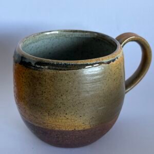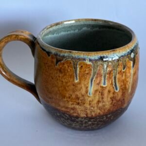 This big round mug shows off the beauty of soda firing with dramatic glossy glaze drips where it was hit with soda, and a quiet side. It has a classic comforting shape, and holds 450mL which I find ideal for a large brew of tea at the start of a work day. The liner glaze…