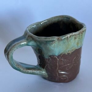 This small (espresso) sized mug was built from a slab of clay that I textured with embroidered fabric. It has a loose carefree style and an undulating rim. It is glazed inside with tenmoku, and the outer the rim and handle has my turquoise glaze. The glaze has run and dripped where the soda hit…
